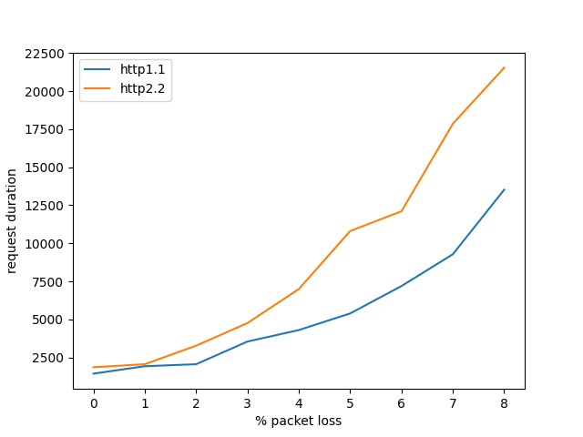As expected, we can see HTTP/1 starts to outperform HTTP/2 even when packet loss is very low.